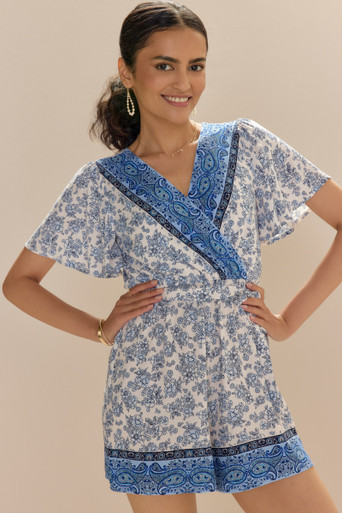 Border Print Front Tie Romper
