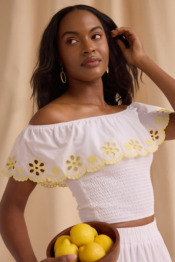 Off Shoulder Eyelet Smocked Top