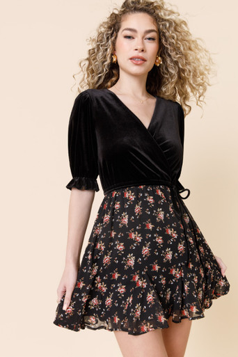 Velvet Puff Sleeve Floral Mini Dress
